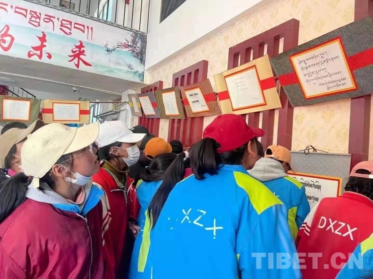 圖為學生們欣賞藏文書法作品(尼瑪加措提供)