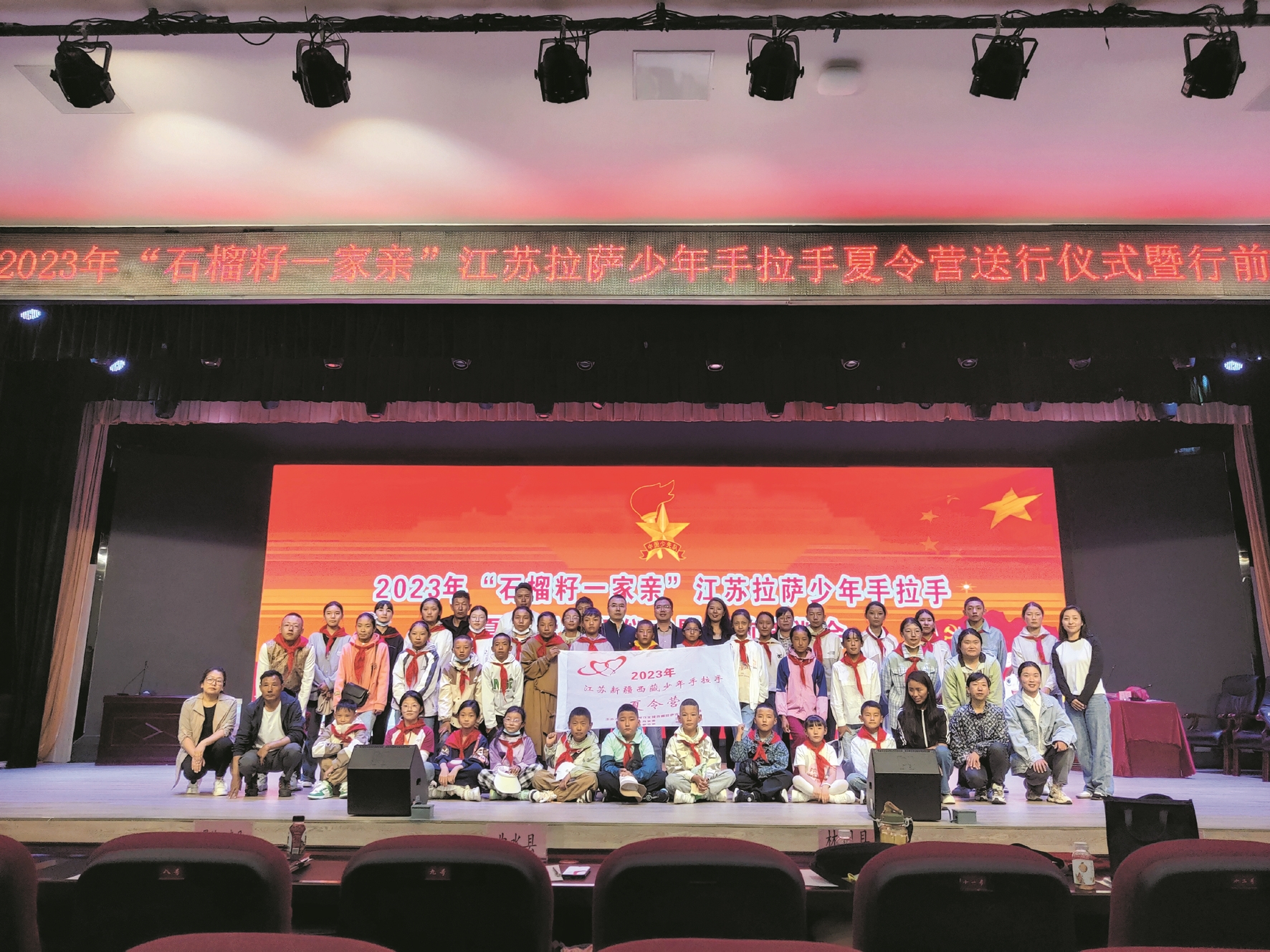 8月2日下午,2023年“石榴籽一家親”江蘇拉薩少年手拉手夏令營(yíng)送行儀式舉行。圖為大家在送行儀式上合影。拉薩融媒記者 余洋洋攝