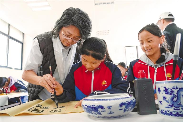 圖為山東省青島市書(shū)法名家手把手教日喀則市桑珠孜區(qū)一中學(xué)生學(xué)習(xí)書(shū)法。記者 汪純 通訊員 王建亮 攝