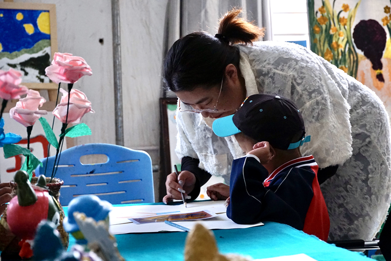 圖為培智美工教室內(nèi),在特教老師輔導(dǎo)下繪畫(huà)的學(xué)生。