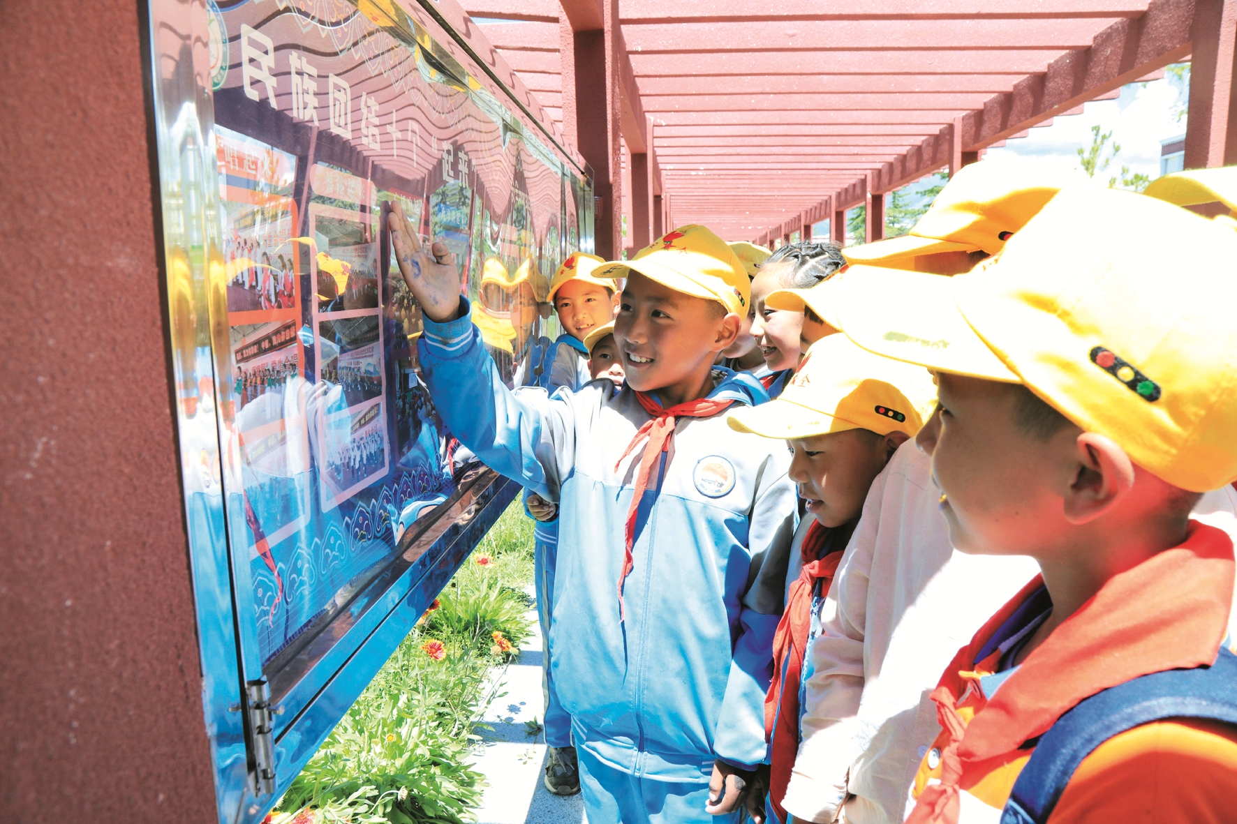 伴隨著初秋的陽光,記者一行驅(qū)車來到了墨竹工卡縣南京實驗小學。上午11時,剛跳完民族健身操的學生們正陸陸續(xù)續(xù)回到教室里準備迎接第三節(jié)課的到來。沿著教學樓往西走大概50米,便可以看到標有“民族團結(jié)教育主題公園”的主題苑。記者在參觀中了解到,該校前期通過積極協(xié)調(diào)有關(guān)部門,于2022年創(chuàng)建了該主題苑。設立在學生宿舍與教學樓之間的主題苑里,展示著民族團結(jié)宣傳標語、民族團結(jié)文化墻以及民族團結(jié)宣傳欄等,形成了濃厚的民族團結(jié)宣傳氛圍。為使民族團結(jié)的種子更深地播種在學生心底,學校還培養(yǎng)了一批學生講解員定期組織學生開展參觀講解活動。來自四年級(4)班的強巴曲吉便是講解員之一。