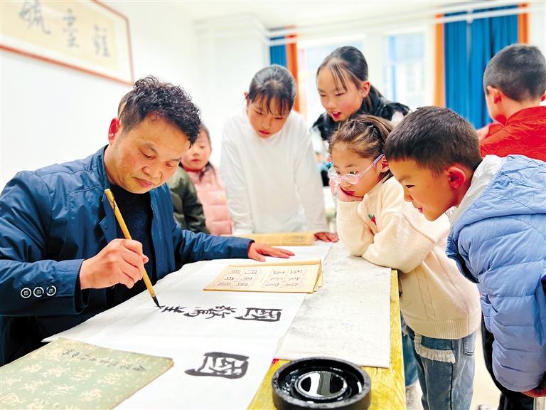 圖為少年宮老師為學(xué)員上書(shū)法課。