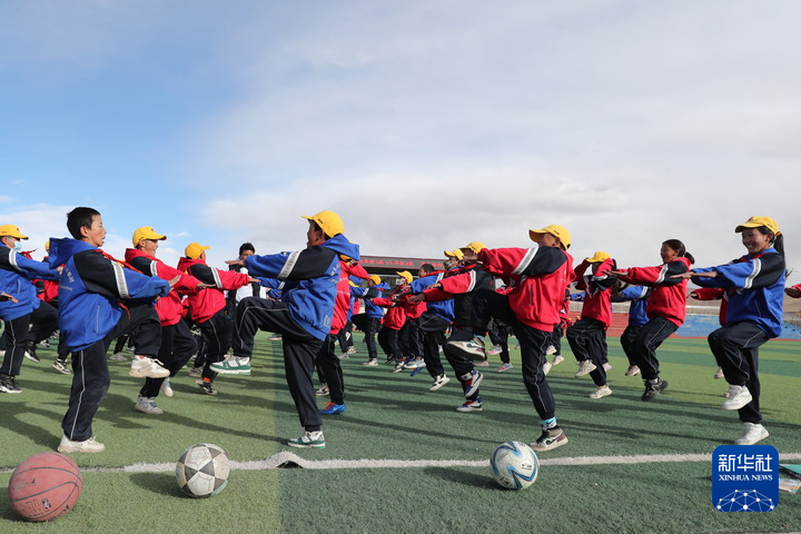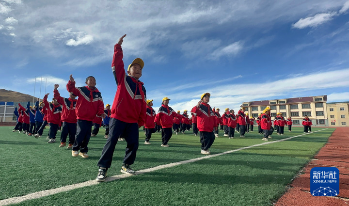 10月13日,在西藏那曲市班戈縣中石化小學(xué),學(xué)生在操場(chǎng)上做運(yùn)動(dòng)。新華社發(fā)(王敬 攝)