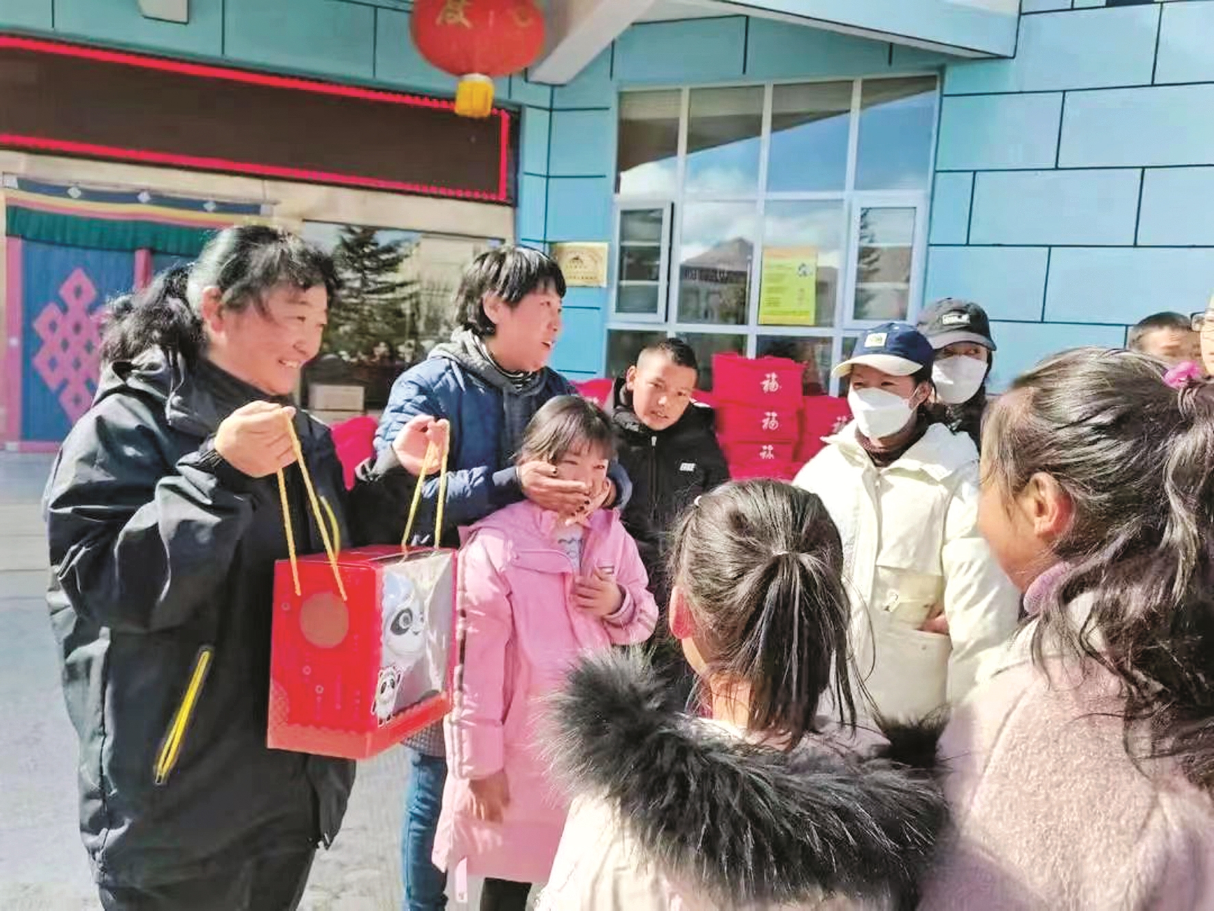 圖為諾布卓瑪(左一)為孩子們分發(fā)福袋。 拉薩融媒記者 齊永昌攝
