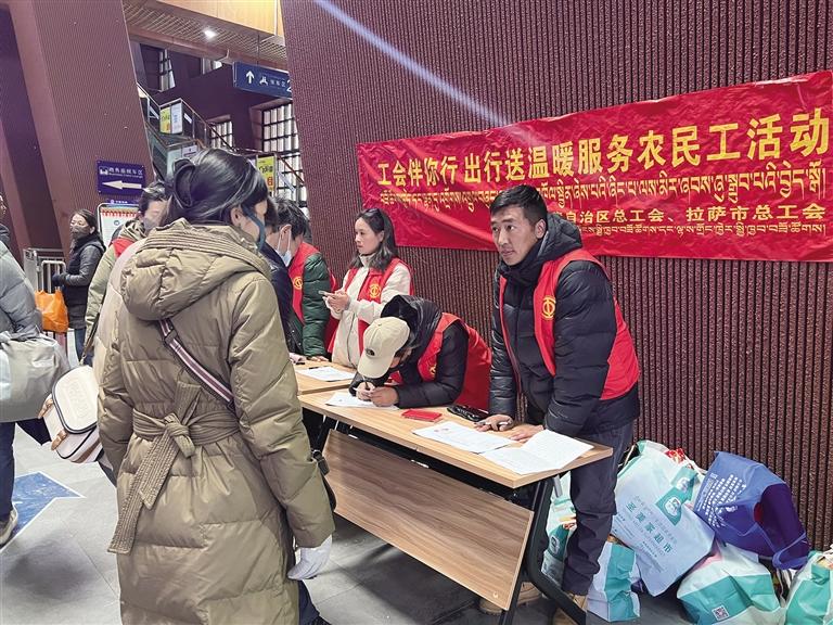 “返鄉(xiāng)的農(nóng)民工可以在我們這里領(lǐng)取一份愛(ài)心禮包哦。”在拉薩火車站來(lái)來(lái)往往的人群中,不時(shí)傳來(lái)吆喝聲。記者看到,在拉薩市總工會(huì)黨組成員、一級(jí)調(diào)研員尼瑪潘多的正前方,已經(jīng)有序地排起長(zhǎng)隊(duì),大家都在等待領(lǐng)取禮包,禮包中有自熱飯、水果、瓜子、面包等食物。記者了解到,春節(jié)前夕,為了讓廣大在藏務(wù)工人員感受到工會(huì)組織“娘家人”的關(guān)心關(guān)愛(ài),西藏自治區(qū)總工會(huì)與拉薩市總工會(huì)聯(lián)合舉辦“工會(huì)伴你行,出行送溫暖,服務(wù)農(nóng)民工”活動(dòng),讓離開(kāi)西藏的務(wù)工人員在火車上也能感受到“拉薩溫度”。