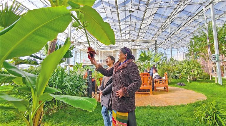 隆冬時節(jié),山南市扎囊縣阿扎鄉(xiāng)的南方植物展示館內(nèi),一派郁郁蔥蔥的景象。椰子樹、鶴望蘭、凌霄花相映成趣。該館是藏草萬畝植物種苗繁育基地的一部分,可為參觀游客提供林草科普知識講解,為學(xué)生開設(shè)生態(tài)課堂進(jìn)行研學(xué)實踐等。