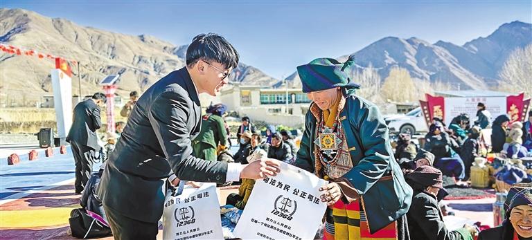 德薩村駐村工作隊(duì)隊(duì)員為群眾發(fā)放法治宣傳物品。張夢琦 記者 扎西頓珠 攝