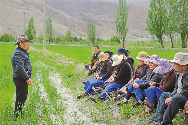 山南市瓊結縣老黨員尼木在下水鄉(xiāng)措杰村的田間地頭給村民黨員講黨課。記者 白瑪澤旺 通訊員 倫珠澤仁 攝