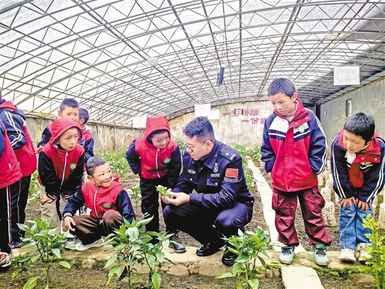 圖為民警與轄區(qū)內(nèi)的小學(xué)生一起采摘蔬菜。次旺曲珍 記者 扎西頓珠 攝