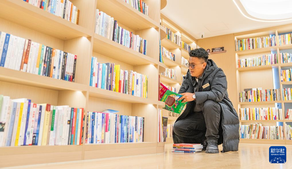 “溫暖嘉·色尼城市書(shū)房”管理員白瑪扎西正在整理書(shū)籍(6月17日攝)。新華社記者 丁增尼達(dá) 攝
