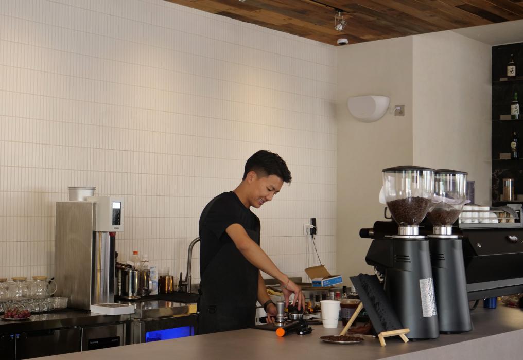 拉巴旦增在店內制作咖啡。(卓瑪 攝)
