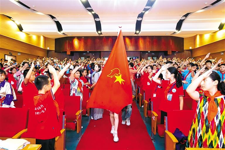 圖為夏令營(yíng)主題隊(duì)會(huì)上,全體少先隊(duì)員向隊(duì)旗敬禮,齊唱《中國(guó)少年先鋒隊(duì)隊(duì)歌》。