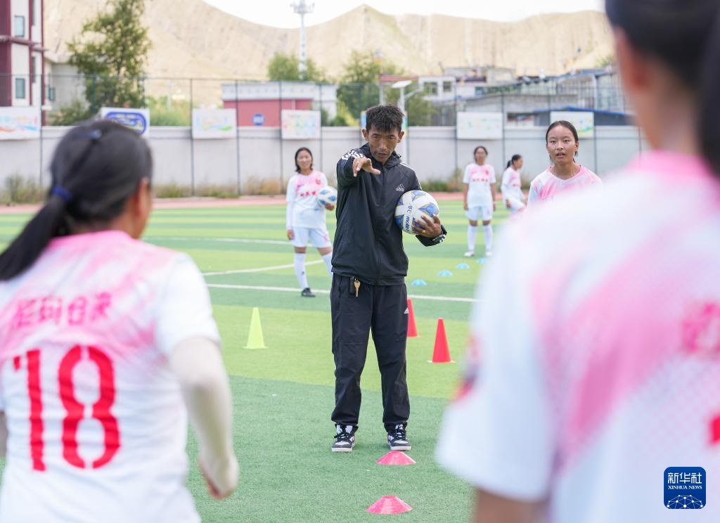 西藏日喀則市上海實驗學校“珠峰雪鷹”女子足球隊教練洛布桑(中)在操場上指導球員訓練(9月3日攝)。新華社記者 丁汀 攝