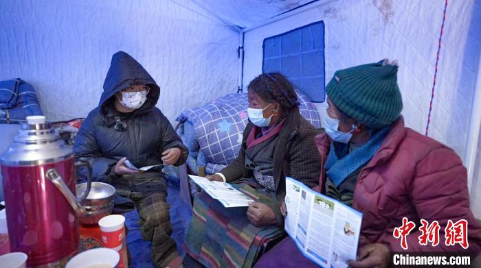 圖為志愿者正在為災(zāi)后民眾進(jìn)行健康宣教。江措 攝