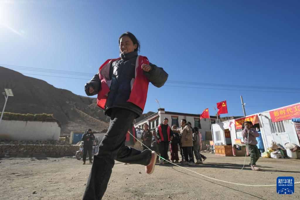 1月25日,在定日縣曲洛鄉(xiāng)熱木青村安置點(diǎn),大學(xué)生志愿者在安置點(diǎn)和孩子們一起玩游戲。新華社記者 晉美多吉 攝
