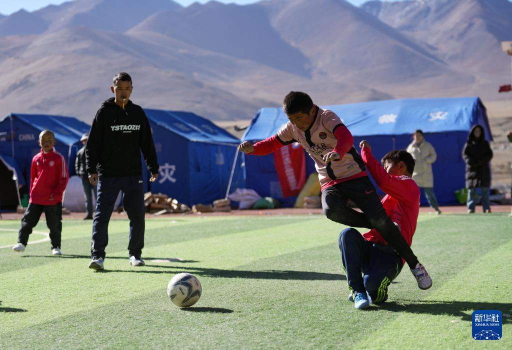 1月26日,在定日縣曲洛鄉(xiāng)完全小學(xué)操場上,長所鄉(xiāng)嘎旦村和曲洛鄉(xiāng)措昂村的孩子們?cè)谶M(jìn)行足球比賽。新華社記者 晉美多吉 攝