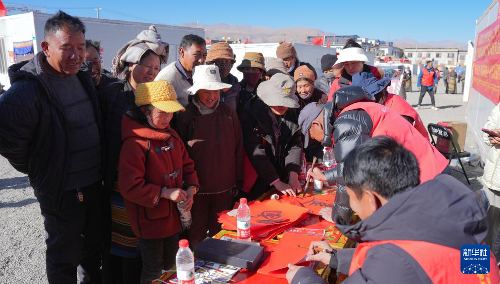 1月26日,書法家協(xié)會(huì)的志愿者在拉孜縣吉如村安置點(diǎn)為受災(zāi)群眾書寫春聯(lián)。新華社記者 晉美多吉 攝
