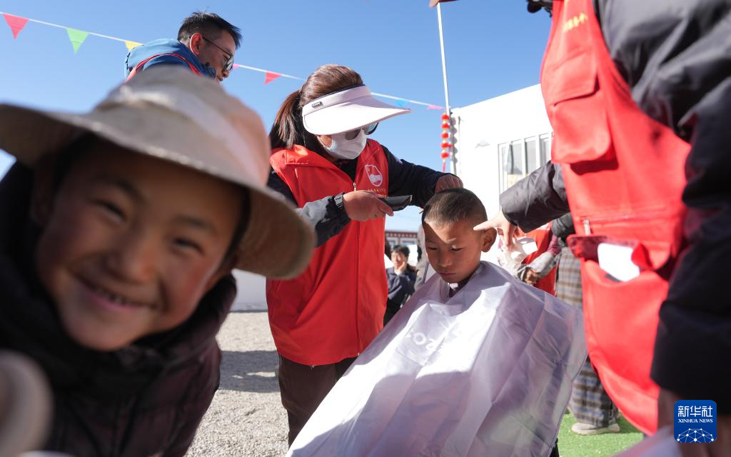 1月26日,志愿者在拉孜縣吉如村安置點(diǎn)給孩子們理發(fā)。新華社記者 晉美多吉 攝