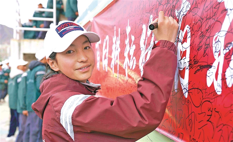 九年級學子在勵志橫幅上鄭重簽名。記者 格桑倫珠 攝