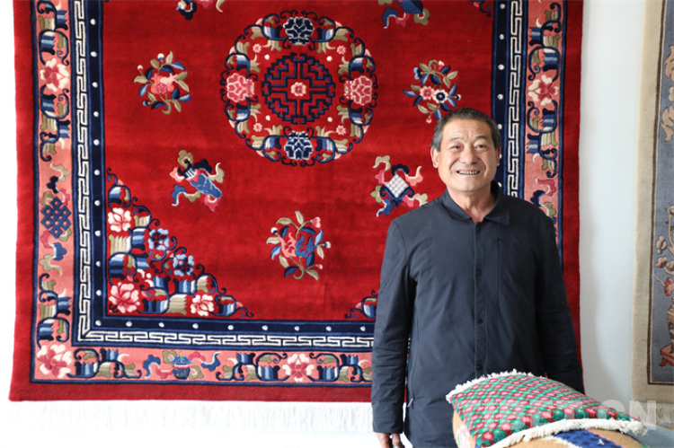 圖為楊永良和傳統(tǒng)圖案的藏毯 攝影:王茜