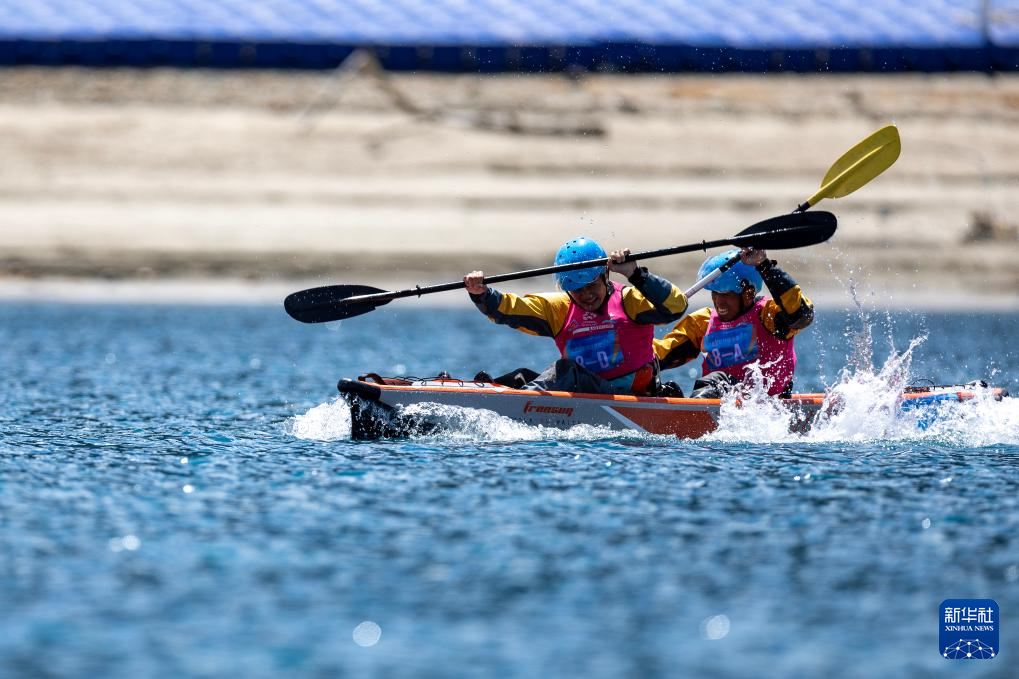 4月20日, “成都伽斯特健身俱樂(lè)部”選手許永召(右)、劉建宇在兩人漂流艇競(jìng)速賽比賽中。他們最終獲得冠軍。新華社記者 姜帆 攝