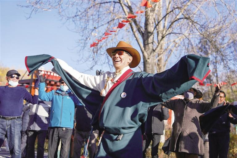 音樂響起,大家隨著節(jié)奏舞動,每個人舉手投足間都是那么自然和率真,大家著裝各異、民族各異,但是所有人臉上洋溢著幸福歡快的笑容。在這里,傳統(tǒng)和現(xiàn)代交織,民族文化交往交流交融。