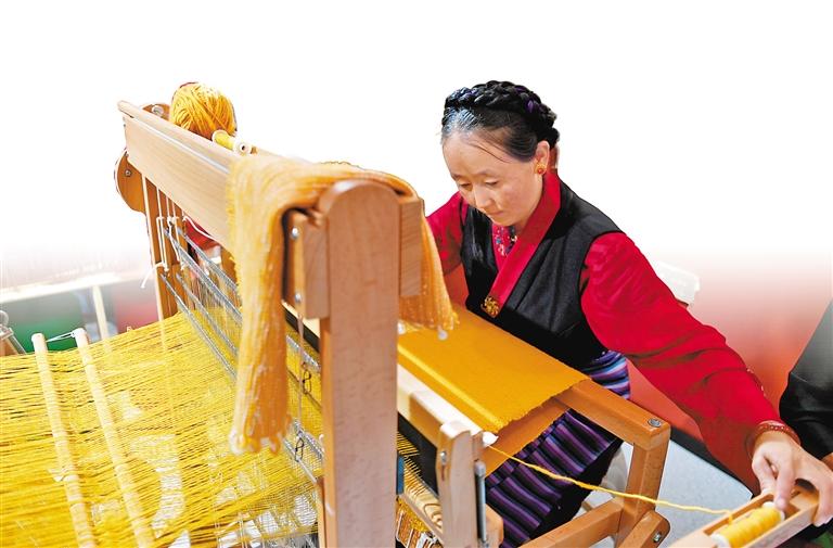 在日喀則市江孜縣江熱鄉(xiāng)班覺倫布村“阿佳格桑工坊”的工人在制作氆氌。記者 王敏 攝