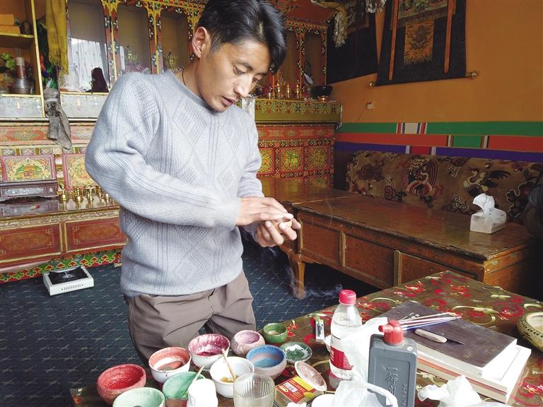 尼瑪次仁因身體殘疾,無法出去工作,也不能從事繁重的農活,這一度讓他感到失落和迷茫。然而,命運在為他關上了一扇門的同時,也為他打開了一扇窗。在龍珠崗村委會的推薦下,他來到了墨竹工卡縣職業(yè)教育中心,開始學習唐卡繪畫。這一選擇,成為了他人生的重要轉折點。