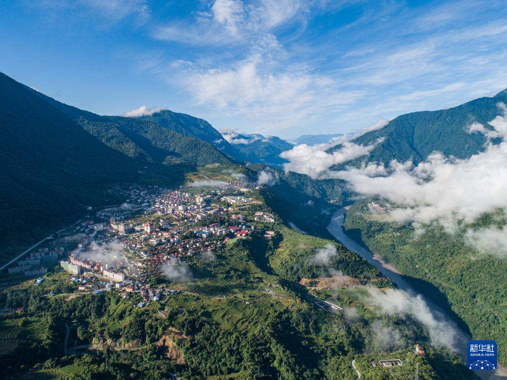 2023年10月13日拍攝的墨脫縣城(無(wú)人機(jī)照片)。西藏林芝市墨脫縣地處雅魯藏布江下游、喜馬拉雅山脈東端南麓,平均海拔約1200米。獨(dú)特的地理環(huán)境造就了濕潤(rùn)多雨的氣候特征,城鎮(zhèn)坐落在高山深谷之中,掩映于云海叢林之間,風(fēng)景秀美。新華社記者 孫非 攝