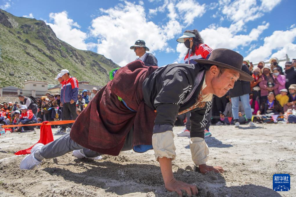 2023年7月20日,聶拉木縣波絨鄉(xiāng)代表隊(duì)選手次仁多吉在押加比賽中。7月18日至21日,西藏日喀則市聶拉木縣2023年農(nóng)牧民運(yùn)動(dòng)會(huì)在聶拉木縣公共體育場(chǎng)舉行。新華社記者 邵澤東 攝