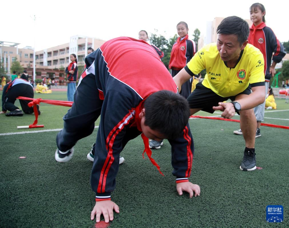 2020年9月9日,貴州省遵義市余慶縣敖溪小學(xué)的體育老師任達(dá)武(右)指導(dǎo)學(xué)生押加的技術(shù)要領(lǐng)。新華社記者 劉續(xù) 攝