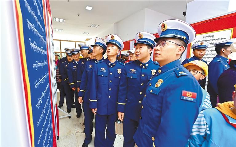圖為西藏森林消防總隊消防員參觀書法展。記者 唐斌 王敏 攝