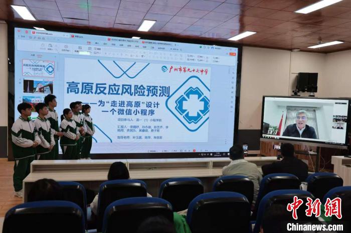 圖為四川大學(xué)華西醫(yī)院院長(zhǎng)、高原醫(yī)學(xué)中心主任羅鳳鳴教授通過視頻連線點(diǎn)評(píng)、指導(dǎo)高中生的微信小程序作品。廣州97中 供圖