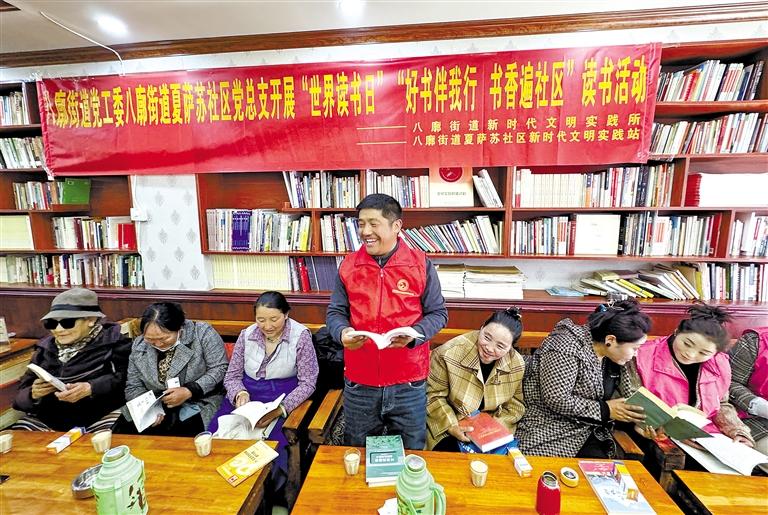 圖為4月23日,拉薩市八廓街道夏薩蘇社區(qū)開展“好書伴我行 書香遍社區(qū)”系列讀書活動(dòng)。圖為社區(qū)工作人員在分享讀書心得。記者 白瑪澤旺 攝