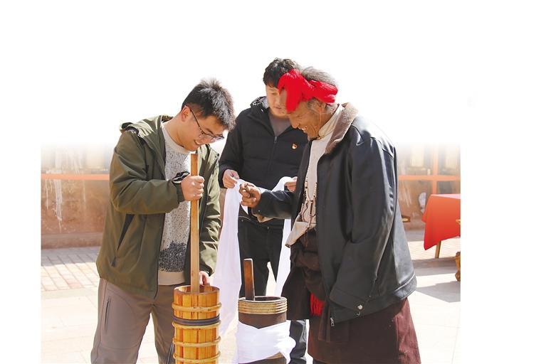 圖為昌都市芒康縣洛尼鄉(xiāng)干部學習酥油茶制作。