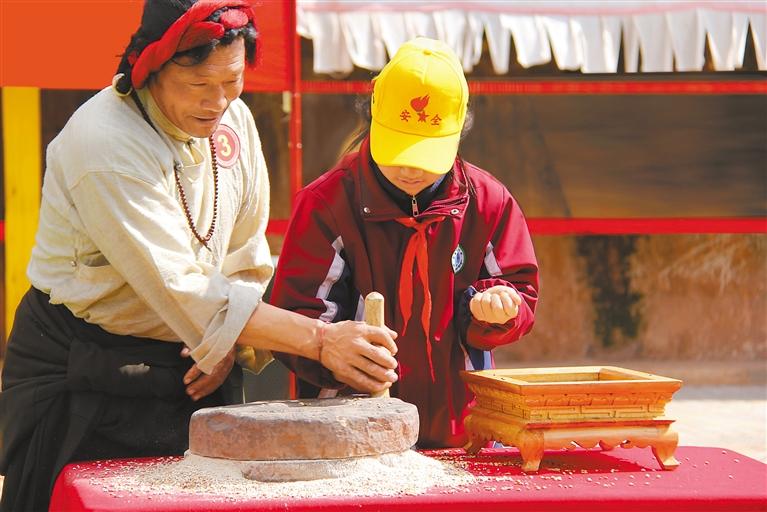 圖為昌都市芒康縣洛尼鄉(xiāng)手藝人指導學生手磨糌粑。 通訊員 董毅 攝