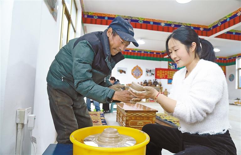 圖為學(xué)員在老師的指導(dǎo)下制作陶藝。記者 格桑倫珠 攝
