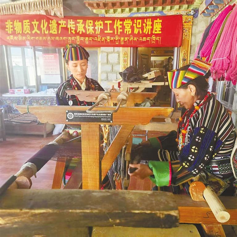 在措美縣非遺展示活動(dòng)現(xiàn)場(chǎng),扎雜村村民在演示織氆氌。