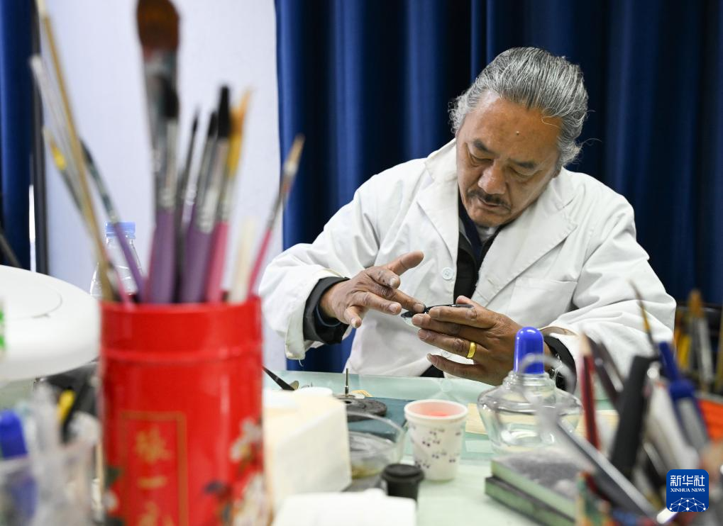布達拉宮貝葉經(jīng)實驗性修復小組實驗室工作人員對用于貝葉修復的顏料進行研磨處理(5月25日攝)。新華社記者 旦增尼瑪曲珠 攝 ??