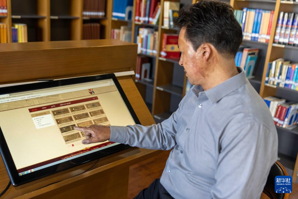 8月13日,西藏自治區(qū)圖書館副館長邊巴次仁在介紹數(shù)據(jù)庫中的藏文古籍。新華社記者 旦增尼瑪曲珠 攝 ??