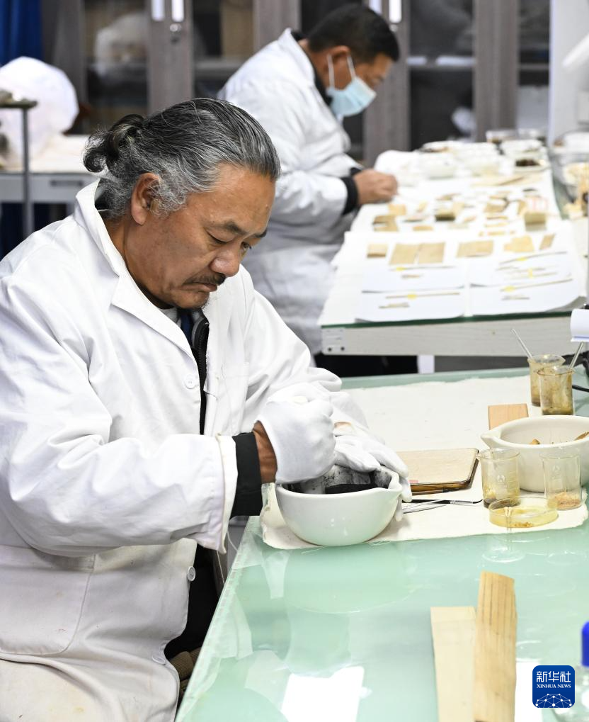 5月25日,布達(dá)拉宮貝葉經(jīng)實(shí)驗(yàn)性修復(fù)小組實(shí)驗(yàn)室工作人員在對用于貝葉修復(fù)的顏料進(jìn)行研磨處理。新華社記者 旦增尼瑪曲珠 攝