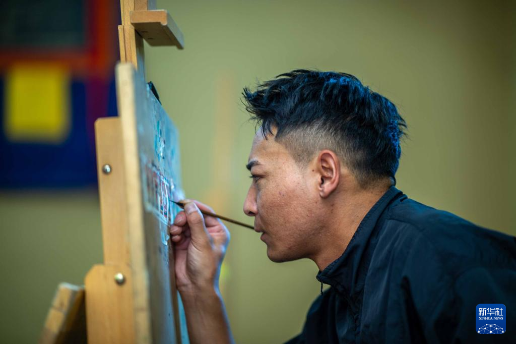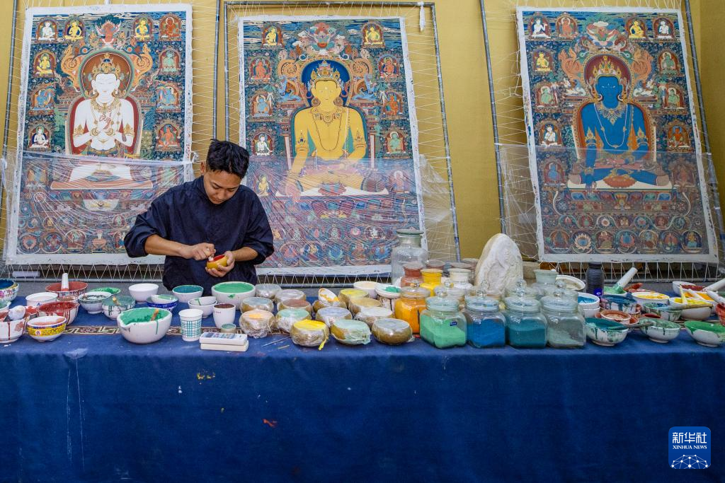 8月6日,一名畫師在繪制唐卡。藏族唐卡(齊吾崗派)入選國(guó)家級(jí)非物質(zhì)文化遺產(chǎn)代表性項(xiàng)目名錄。新華社記者 旦增尼瑪曲珠 攝 ??