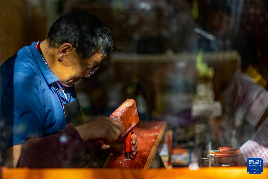 8月6日,雕刻師在工作中。西藏雪巴康雕版印刷制作技藝入選西藏自治區(qū)級(jí)非物質(zhì)文化遺產(chǎn)代表性項(xiàng)目名錄。新華社記者 姜帆 攝 ??