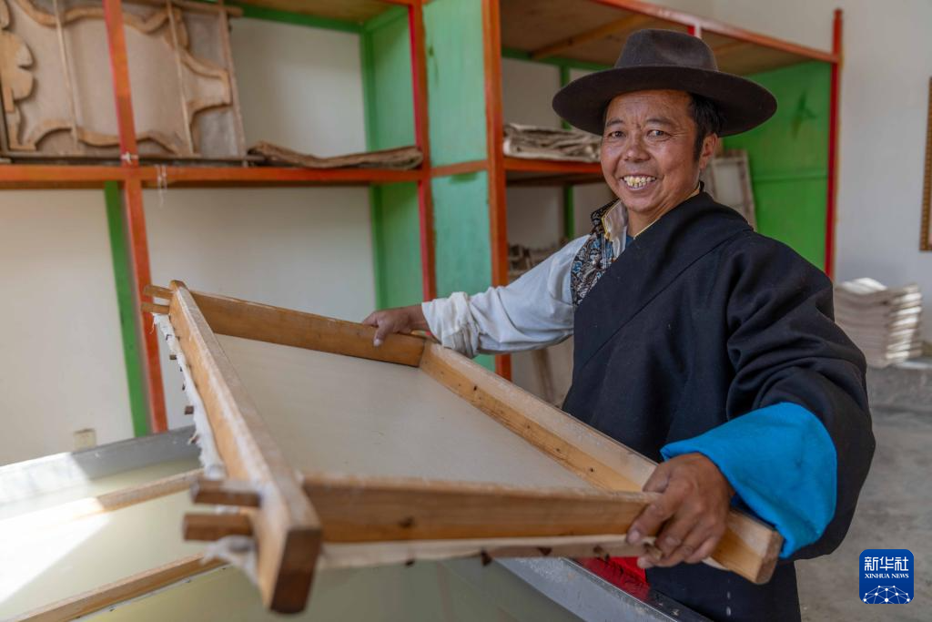 8月12日,雪拉藏紙制作技藝自治區(qū)級(jí)代表性傳承人格桑旦增在制作藏紙。新華社記者 旦增尼瑪曲珠 攝 ??