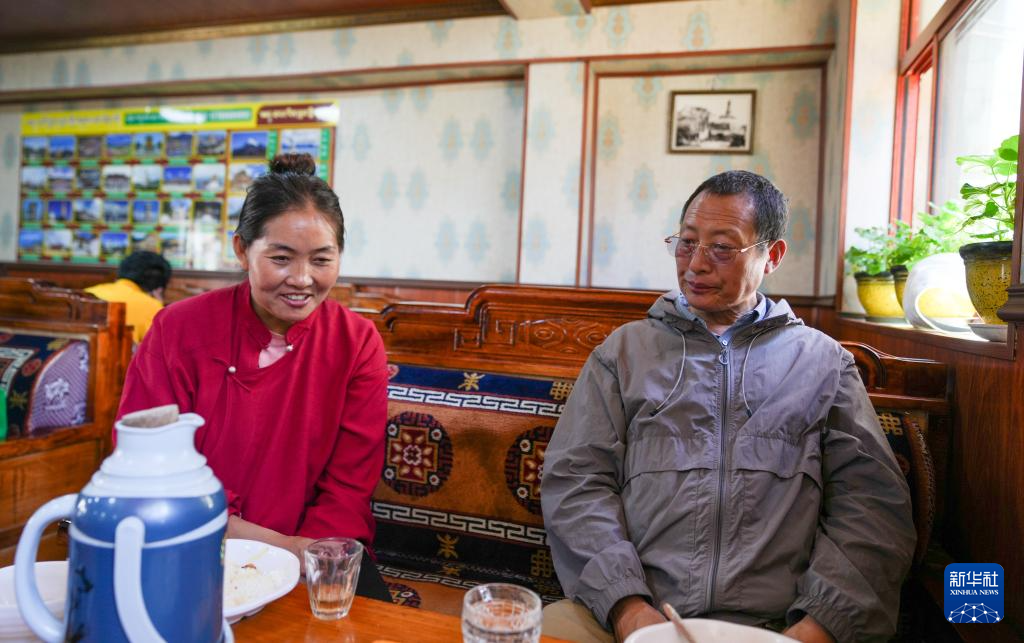 洛桑麥朗(右)和畢業(yè)學(xué)生在甜茶館吃午飯時(shí)回答學(xué)生的問題(8月15日攝)。新華社記者 晉美多吉 攝