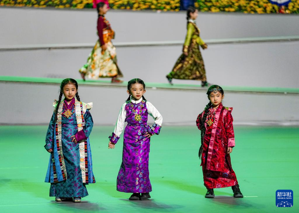 在首屆西藏“衣脈相承”服飾文化周上,小朋友在展示各式藏裝(2025年1月5日攝)。新華社記者 晉美多吉 攝