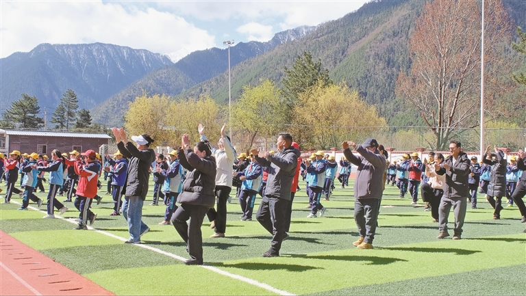 學(xué)校師生正在跳融入了珞巴舞蹈元素的課間操。記者 謝筱純 王珊 劉楓 攝