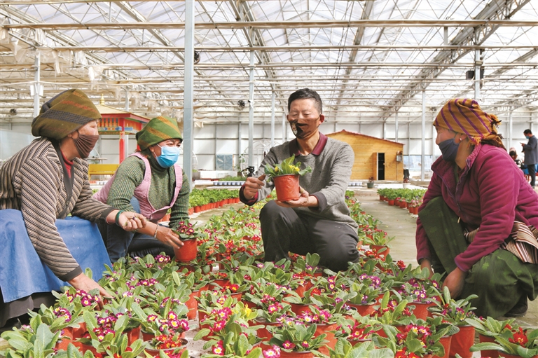 在鄉(xiāng)村振興建設(shè)中,林周縣走出了自己的特色致富路,優(yōu)秀產(chǎn)業(yè)項(xiàng)目遍地開花。圖為技術(shù)員為群眾講解花卉種植知識(shí)。 拉薩融媒記者 龍俊霖?cái)z
