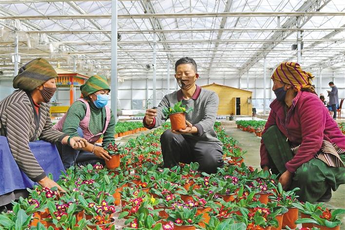 圖為在林周縣陽光溫室示范園區(qū),技術人員在指導村民種植花卉?!∮浾摺⊙虢稹z