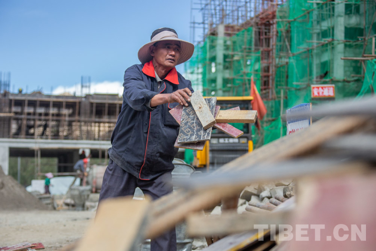 圖為西藏自治區(qū)山南市隆子縣隆子鎮(zhèn)扎果村村民旺堆在隆子縣日當鎮(zhèn)宗那建筑有限公司正在建設中的祿東贊大酒店工作攝影:趙耀